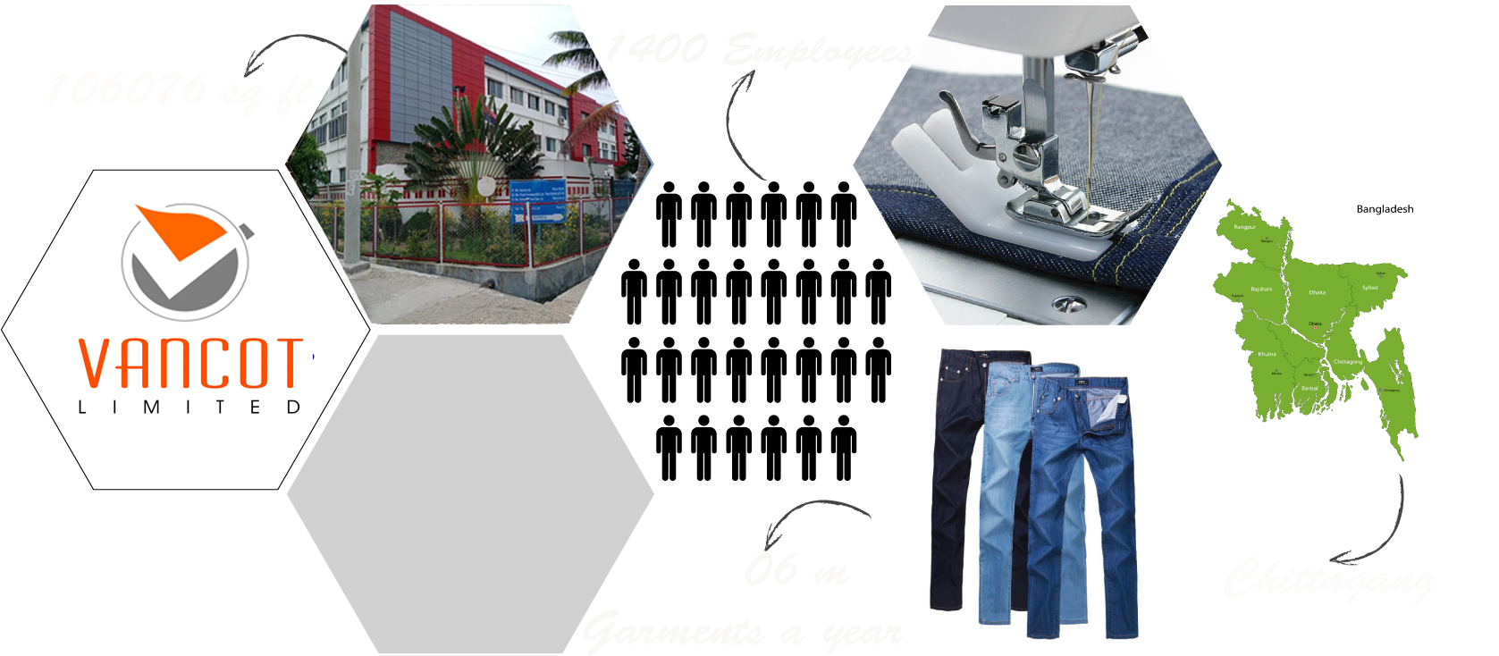 Vancot Limited. having three production floors each floor with an area of 27468 square feet and total production floor area is 82404 square feet. The building is built on a land area of 3 acres, to accommodate current needs & future growth. The structural compliance of the building has been certified by number of foreign and local organizations including ACCORD.